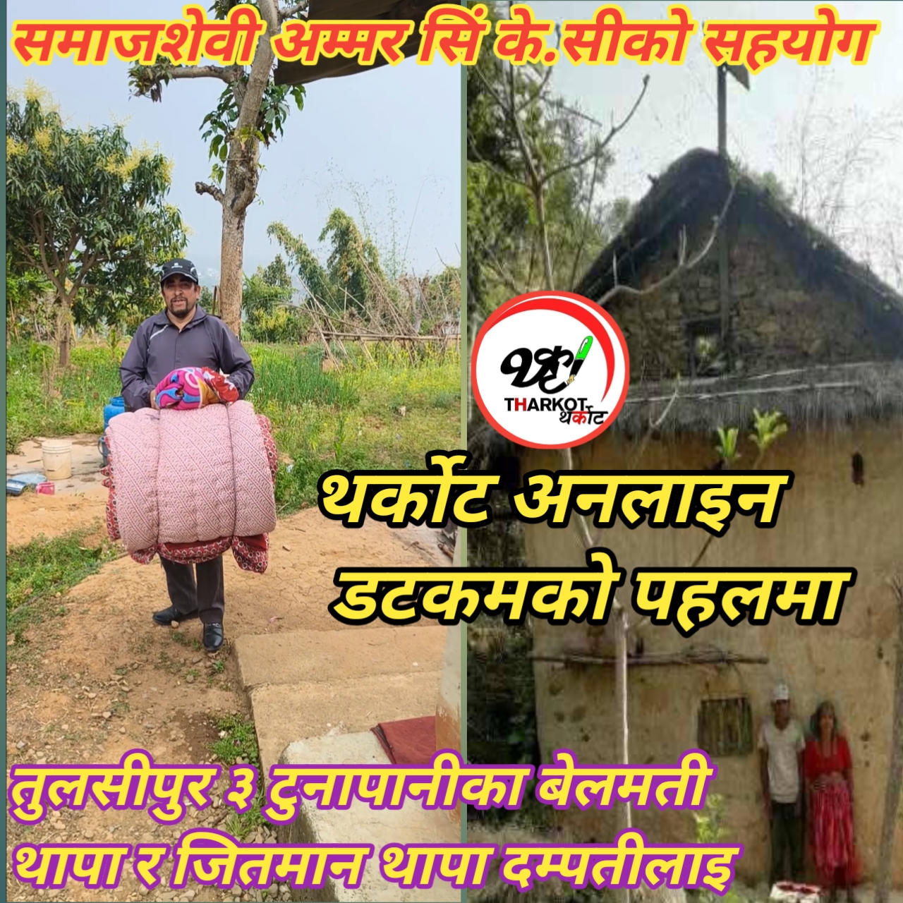 समाजशेवी अम्मर सिं के.सीको सहयाेग तुल्सिपुर ३ टुनापानीका बेलमती थापा र जितमान थापा दम्पतीलाइ थर्काेट अनलाइन डटकमले पठायाे ।