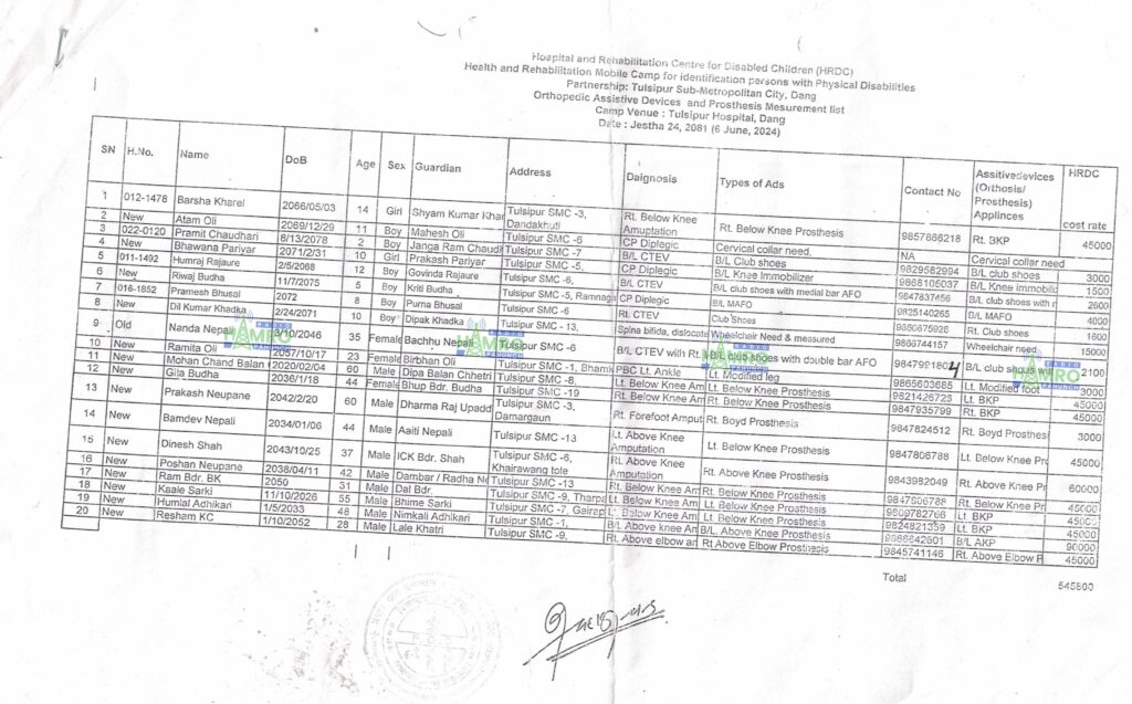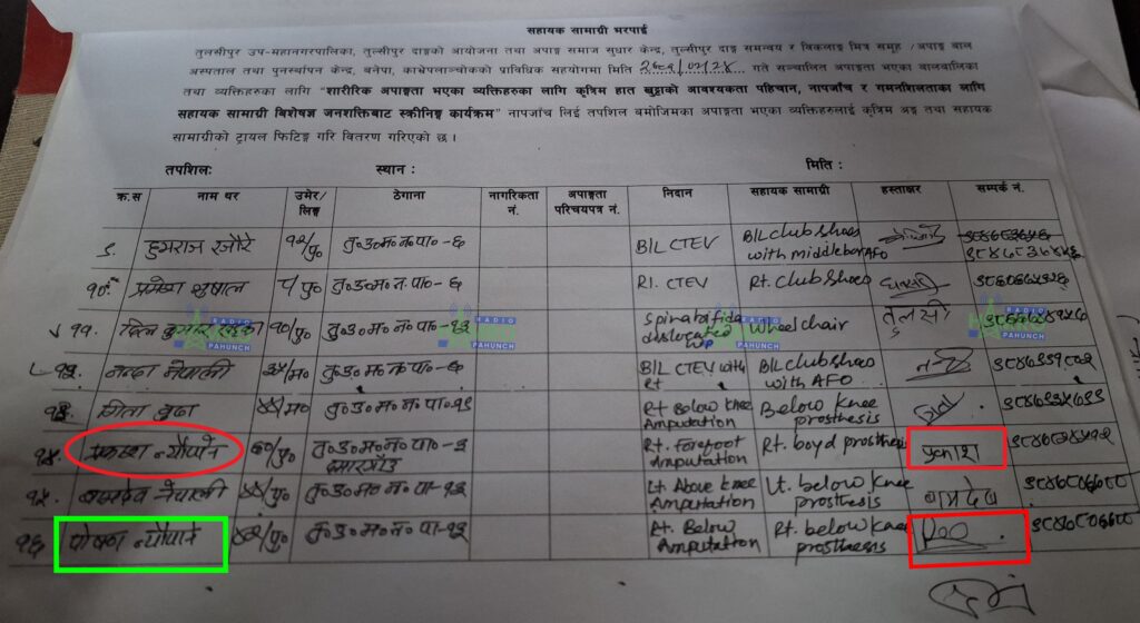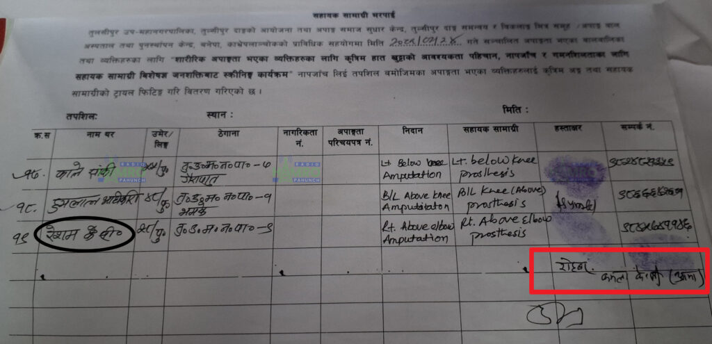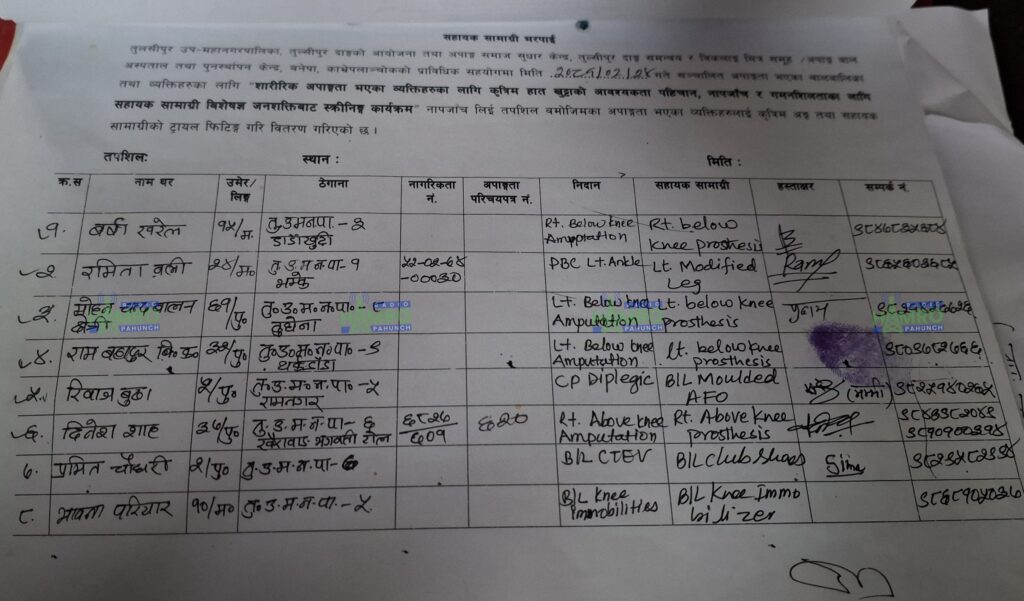 तुलसीपुर उपमहानगरपालिकाको कार्यक्रम भएपनि स्थानीय स्तरमा समन्वयका लागि अपाङग समाज सुधार केन्द्रलाई सहायता सामग्री उपलब्ध गराउने संस्था एचआरडिसीले समन्वयकर्ताको रुपमा छनोट गरेको थियो । त्यसपछि पालिकासंग मिलेर अपाङगता भएका व्यक्तिहरुको सहायक सामग्रीको नापजाँच तथा ट्रयाल फिटिङको कार्यक्रम आयोजना गर्नुपर्ने थियो । तर भने अनुसार कार्यक्रम नै नगरी २०८१ जेठ २४ गते भरपाइ गरी एक जनालाई निःशुल्क सहित २० जनालाई सामग्री वितरण गरेको देखिएको छ । विवरण अनुसार ६ जनाले सामग्री नै पाएका छैनन् । जसमा तुलसीपुर–३ का प्रकाश न्यौपाने र तुलसीपुर–१३ का पोषण न्यौपानेको हस्ताक्षर किर्ते गरेको पाइएको छ । यस्तै तुलसीपुर–१३ का बामदेव नेपाली, तुलसीपुर–७ का प्रमित चौधरी, तुलसीपुर–१९ का गिता बुढाले पनि हालसम्म सामग्री पाएका छैनन् । यसरी हेर्दा सामाग्री नपाएकै अवस्थामा सामग्री पाएको भनि भुक्तानी भएको देखिएको छ । २०८१ जेठ २४ मा कार्यक्रम नगरेरै नक्कली भरपाई तयार गरेर तुलसीपुर उपमहानगरपालिकाको जनस्वास्थ्य प्रबद्र्धन शाखामा अपाङग समाज सुधार केन्द्रका कार्यक्रम संयोजक हुमकान्त कँडेलले कागजात पेश गर्नुभएको कुरा खुल्न आएको हो । त्यसको ठिक एक महिनापछि २०८१ असार २४ मा जनस्वास्थ्य शाखा प्रमुख ओमप्रकाश न्यौपाने ९ओम पि न्यौपानेले० पालिकाबाट सोही कागजात पेश गरी ७ लाख ८० हजार रुपैंया पेश्की लिएको देखिएको छ । सामान्यतया नीति अनुसार कार्यक्रम गर्नुपूर्व बजेट अनुमान गरी पेश्कि लिनुपर्ने हुन्छ तर त्यसो नगरी किर्ते कार्यक्रम सम्पन्न भएको एक महिनापछि पेश्कि लिनु कानुन विपरित होईन र ।