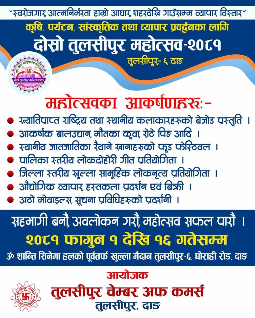 यसैबीच शनिबार महोत्सवमा चर्चित गायिका आस्था रावत आउन लागेकी छिन् । चौबन्दीमा पटुकी बाँध्या छैन बोलको गीतबाट चौतर्फी चर्चामा पुगेकी रावतले शनिबार तुलसीपुरमा सञ्चालन भएको दोस्रो कृषि पर्यटन तथा व्यापारिक महोत्सवमा आफ्नो प्रस्तुति राख्ने महोत्सव मूल आयोजक समितिले जनाएको छ । फागुन १ गतेदेखि सञ्चालन भएको महोत्सव फागुन १६ गतेसम्म चल्नेछ । महोत्सवमा विभिन्न स्थानीय उत्पादन, कृषि, हस्तकला, परम्परागत परिकार, तथा पर्यटन प्रवर्द्धनका स्टलहरू राखिएका छन् । जसमा सांस्कृतिक कार्यक्रम, कृषि प्रदर्शनी, तथा उद्यमशीलता प्रवर्द्धनसम्बन्धी विभिन्न कार्यक्रमहरू समावेश छन् ।