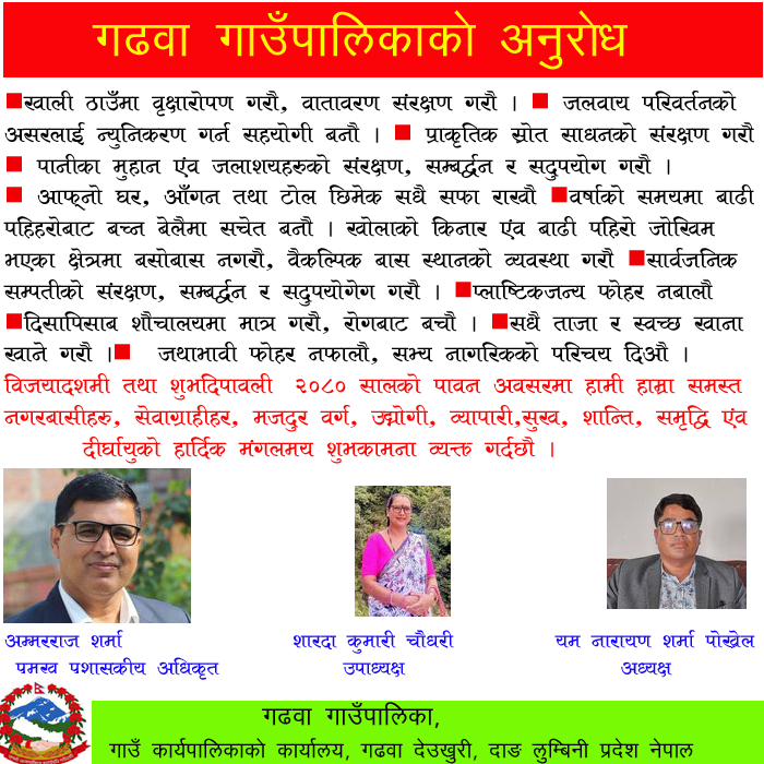 थारुकुमालले भनेका थिए ।ु रामलाल थारु कुमाल र राज बहादुर थारु कुमालले निर्माण गरेका सेरामिक सामाग्रीहरु गढवा गाउँपालिकाको कृषि एम्बुलेन्सबाट दाङको तुलसीपुरमा बिक्री वितरणका लागि लगिएको छ। पांच सय थान गमला र आठ सय थान खुद्रूके थोकदर रेटमा पालिकाको कृषि एम्बुलेन्सबाट बिक्री वितरण गर्न पाउँदा आफुहरुमा धेरै आशा पलाएको राज बहादुर थारु कुमालले बताएका थिए।खुद्रा मुल्य राम्रो रहेतापनि निर्माण गरेका समाग्रीहरु समयमा बजार नपाउँदा थप समस्या झेल्नु परेको कुमालले बुनेका थिए। गढवा गाउँपालिकाको खैरा गाँउमा अत्याधिक मात्रमा सेरामिक निर्माण भएको तर बजारीकरणको समस्या रहेको जानकारी पाए पश्चात आफुले गढवा गाउँपालिकाको कृषि एम्बुलेन्स मार्फत सम्बन्धित बजार सम्म पुर्याउने वारे सोच बनाएको र शुक्रबार मात्रै कृषि एम्बुलेन्स मार्फत गमला र खुद्रूके गरी करिव आठ सय सामाग्रीहरु बिक्री बितरण भएको गढवा गाउँपालिका अध्यक्ष यमनारायण शर्मा पोख्रेलले बताउनुभयो।