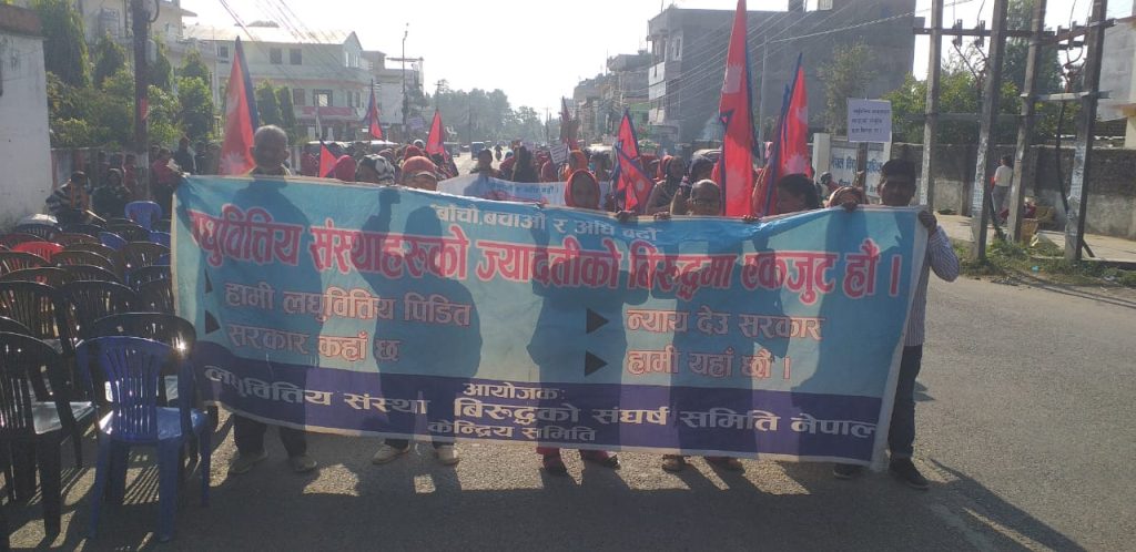 लघुवित्तिय संस्था विरूद्वको संघर्ष समिति नेपालका केन्द्रिय उपाध्यक्ष गगन वि.कले संघर्ष समिति भनेको यस देशका आतंककारी, जाली, फटाहा, भष्ट्रचारी, गरिव जनताको रगत पसिना चुसाहालाई कारवाहीको दायरामा ल्याउनुका साथै, लघुवित्त वित्तिय संस्थाको खारेजीका साथसाथै सहकारी संस्थाहरू र बैंकका ऋणहरू मिनाहा तथा खारेजीका लागि अगाडि बढेकाले सम्पूर्ण पीडितहरू एकजुट हुन सबैमा आग्रह गर्नुभएको छ । उहाँले जबसम्म पीडित दिदीबहिनीहरूलाई हर्जना, जरिबाना, सेवा शूल्क लगायतका विभिन्न बाहना पारी आम गरिव जनताहरूसँग लिएको ३० वर्षको हिसाव किताब गर्दैन तबसम्म संघर्ष समितिको आन्दोलन नरोकिने समेत बताउनु भएको थियो । लघुवित्तिय संस्था विरूद्वको संघर्ष समितिनेपालले दाङको घोराहीमा आयोजना गरेको जिल्ला स्तरीय भेलालाई सम्बोधन गर्दै लघुवित्त वित्तिय संस्थाद्वारा ५८ लाख ऋणी दिदीबहिनीहरू मध्य ६० हजार एकदमै पीडित, ३३ लाख ऋण तिर्नै नसक्ने र १० लाख बढी दिदीबहिनीहरू करौडौको किस्ता हाल्ने पाईएको बताउनुभएको थियो । उहाँले भेलालाई सम्बोधन गर्दै सम्पूर्ण लघुवित्त वित्तिय संस्थाहरूले जबसम्म पीडित महिलाहरूको अधिकार पुरा गर्न सक्दैनन् तबसम्म संघर्ष समतिको आन्दोलन पनि नरोकिने बताउनुभएको हो ।