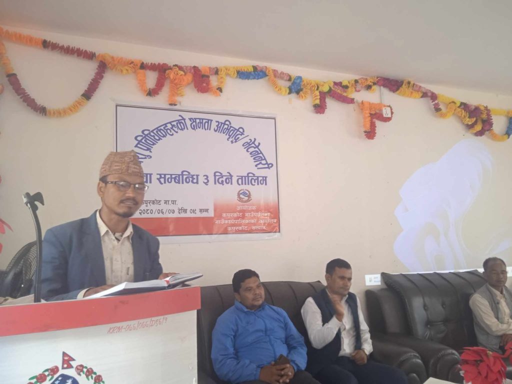 गाउँपालिका उपाध्यक्ष प्रकाश भण्डारीले पालिकाको पशुपन्छी व्यवसायको प्रचुर संभावनालाई केन्द्रमा राखी पशुपालक कृषक, उधमी, व्यवसायीहरुलाई सहयोग पुय्राउने गरी प्राविधिकहरूको क्षमता अभिवृद्धि तालिमले निशेष भूमिका खेल्ने बताएका थिए । कपुरकोट गाउँपालिकाले पशुपन्छी जन्य उत्पादकत्व वृद्धि गर्ने, परम्परागत एवं निर्वाहमुखी पशुपन्छी पालनलाई व्यवसायिकरण गर्ने, दुग्ध पदार्थ, मासु ,अण्डा उत्पादन गरी कुपोषण हटाउने लगायतका कार्यक्रम बनाएको भण्डारीको भनाई रहेको थियो । पशु शाखा प्रमुख अरुणा भण्डारीले सहजिकरण गरेको कार्यक्रममा वडा नम्बर २ का वडा अध्यक्ष ईश्वर बुढा, वडा नम्बर ४ का वडा अध्यक्ष मित्रलाल कठायतले तालिमबाट प्राप्त गरेका ज्ञानलाई किसानका गोठ तथा खोर सम्म पु(याएर सहयोग गर्न अनुरोध गरेका थिए। मंगलबार सम्म हुने तालिमको प्रशिक्षकमा पशु अस्पताल तथा पशु सेवा कार्यालय सल्यानका डा. जयन्त महत र शहीद नेत्रलाल बहुप्राविधिक शिक्षालय सल्यानका डा. बालकृष्ण पाण्डे रहेका थिए ।