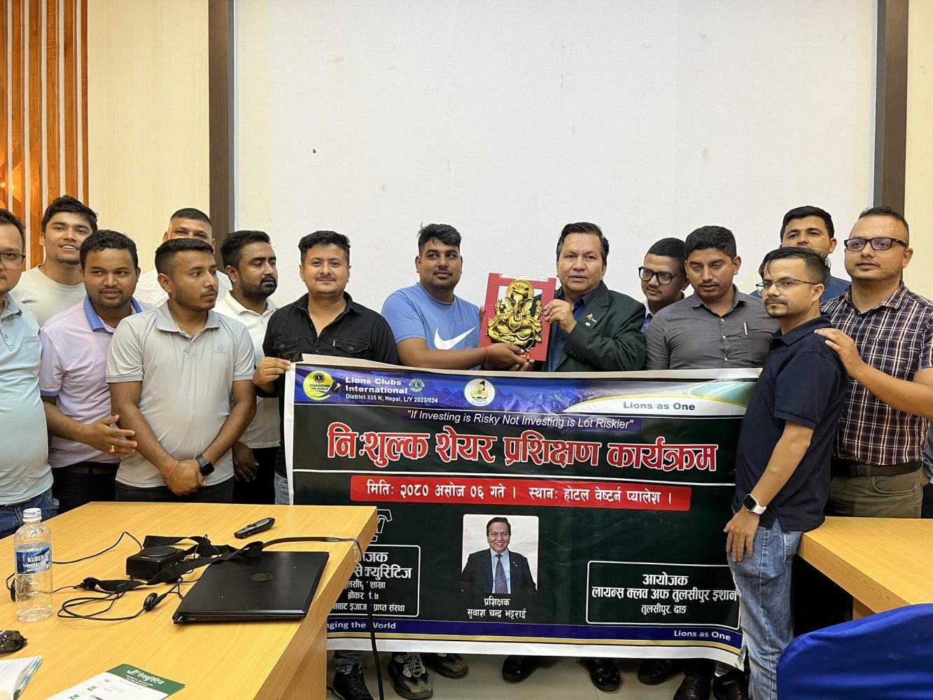 तुलसीपुर,६ असोज।दाङको तुलसीपुरमा शनिवार निःशुल्क शेयर प्रशिक्षण कार्यक्रम सम्पन्न भएको छ । लायन्स क्लव अफ तुलसीपुर इशान को आयोजना तथा जे एफ सेक्युरिटिज तुलसीपुर शाखाको सहयोगमा शेयर सम्वन्धि प्रशिक्षण कार्यक्रम…