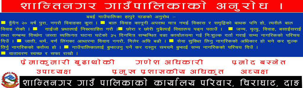 थर्कोट समामचारदाताशान्तिनगर मंसिर १९ गते ।दाङको शान्तिनगर गाउँपालिकामा नयाँ प्रमुख प्रशासकीय अधिकृतलाई स्वागत गरिएको छ । प्युठानको प्युठान नगरपालिकाबाट सरुवा भई दाङको शान्तिनगर गाउँपालिकामा आउनुभएका प्रमुख प्रशासकीय अधिकृत भिष्मकुमार मल्ललाई…